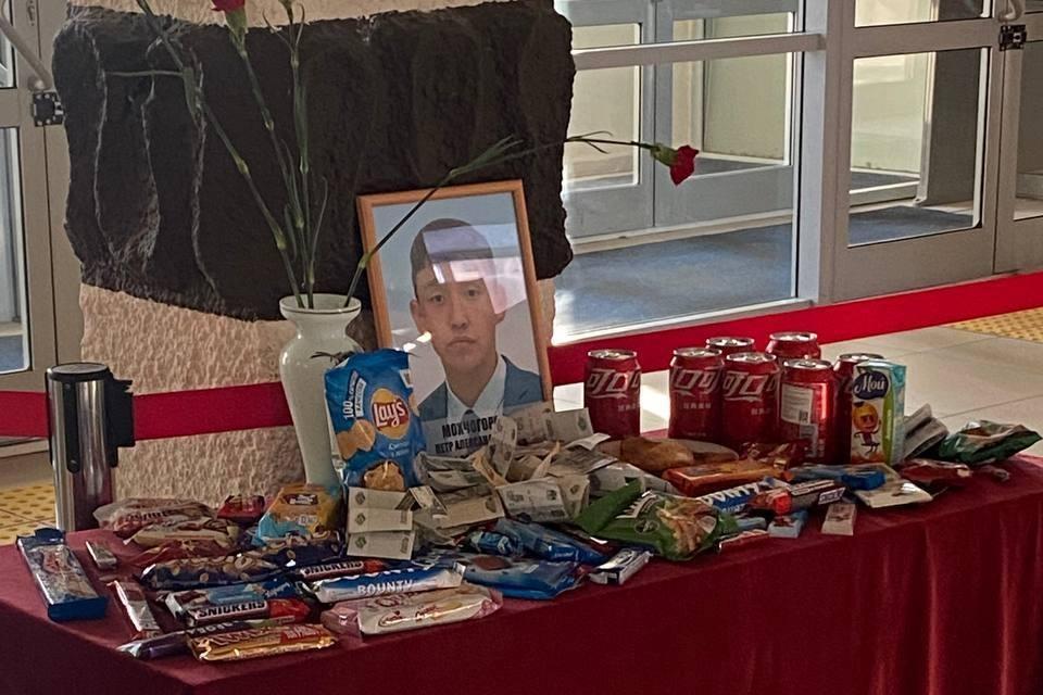 Мемориал убитому студенту в корпусе СВФУ заполнился конфетамиСтуденты массово несут к столу газировку, чипсы и шоколадные батончики